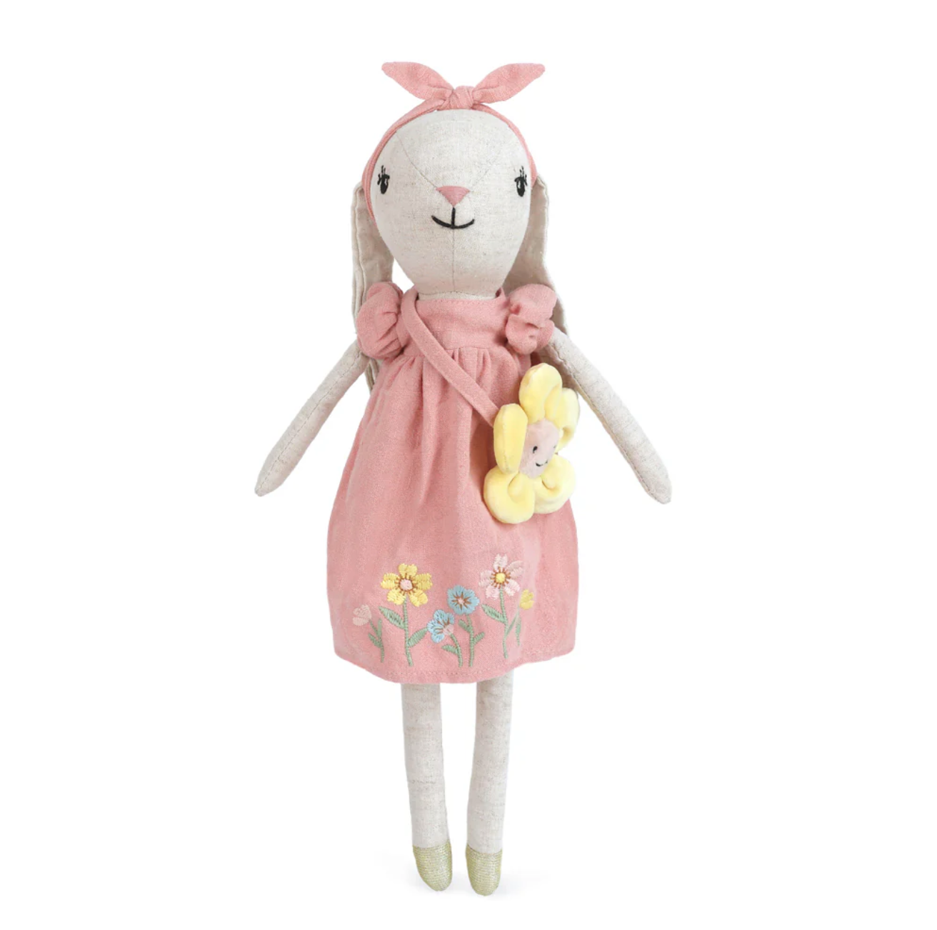 Say hello to Lila Bunny, the cutest bunny ready for springtime fun! Dressed in a darling pink dress with embroidered flowers and a charming bow headband, she’s all about style and adventure. Her soft yellow flower crossbody purse is perfect for her tiny outings! With an embroidered face, pink nose, and floppy ears full of personality, Lila Bunny is the perfect snuggle buddy for playtime—or the sweetest surprise in any special Easter basket!