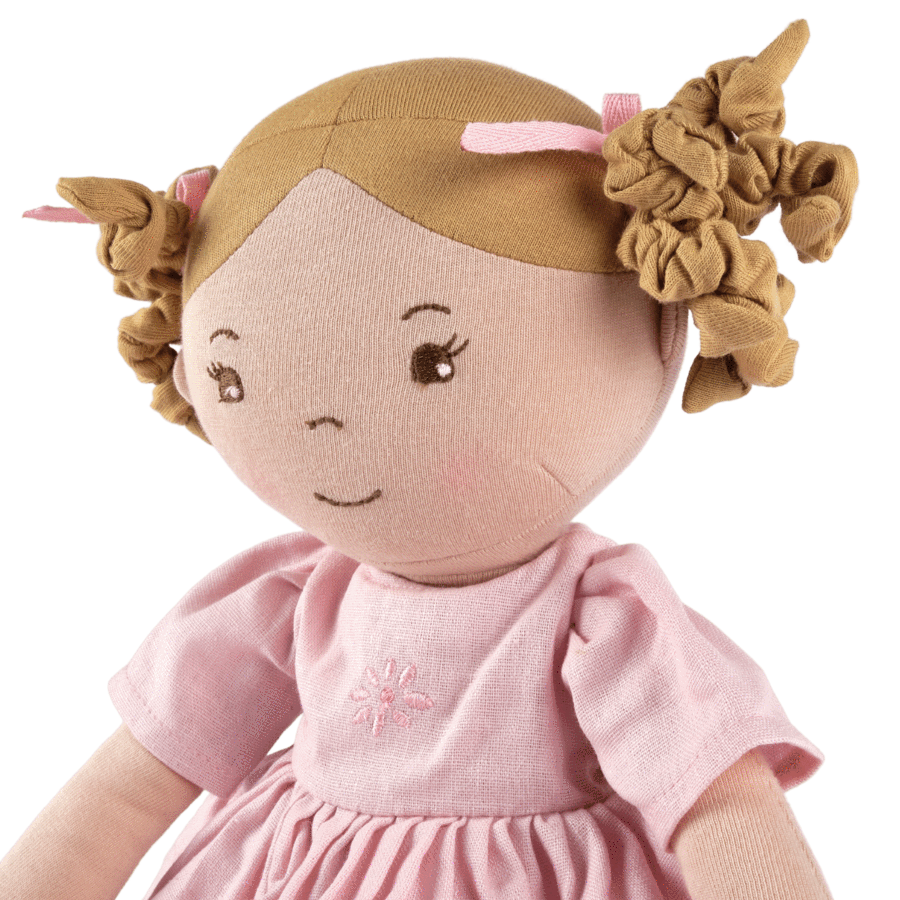 Amelia is a soft doll toy and is wearing a beautiful pink all-natural linen pink dress with matching shoes, stripy pink tights, and pink hair ribbons.