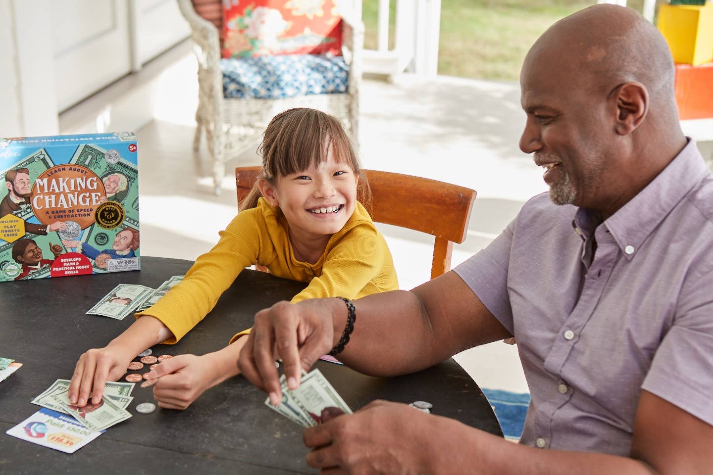 Making Change is an educational game where players use mental math to subtract the price of an item from the amount paid to make the correct change. Whoever collects the most items wins, get one item from each of 10 categories for bonus points. Making Change helps to build practical math skills.