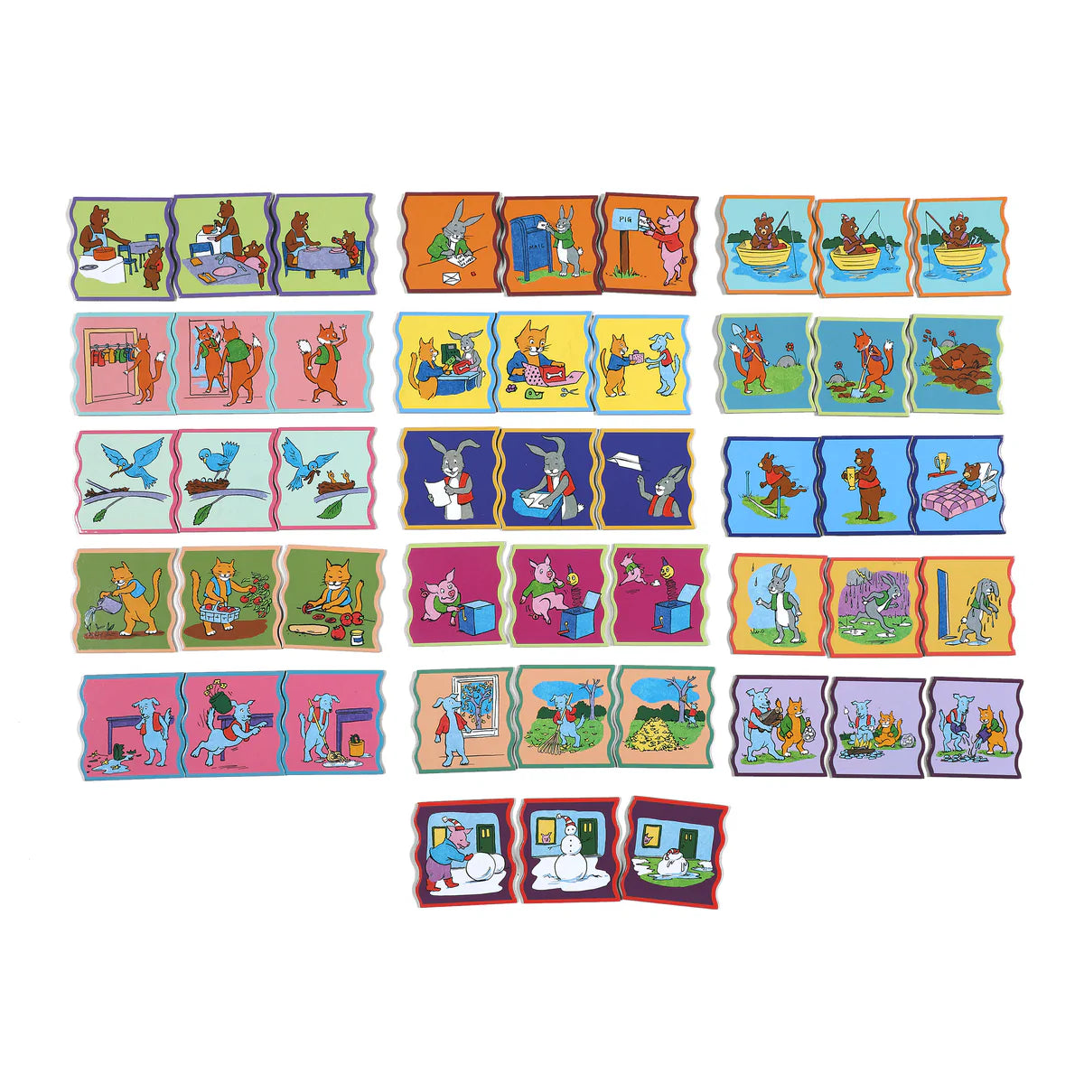 All in Order Logical Sequencing Set helps to build logical ordering and executive functioning skills while cultivating memory, verbal skills, and predictive reading. Sequencing is an essential foundational skill. Children place the 3 color-coded illustrated tiles in the order in which the events occurred. It is an easy and enjoyable way to generate conversation with younger children about the social and practical details that underlie many common events. Engaging, accessible illustrations by Saxton Freymann.