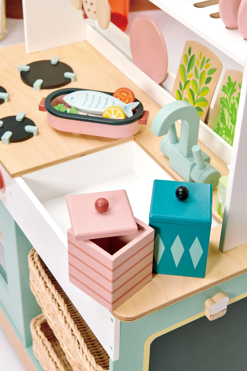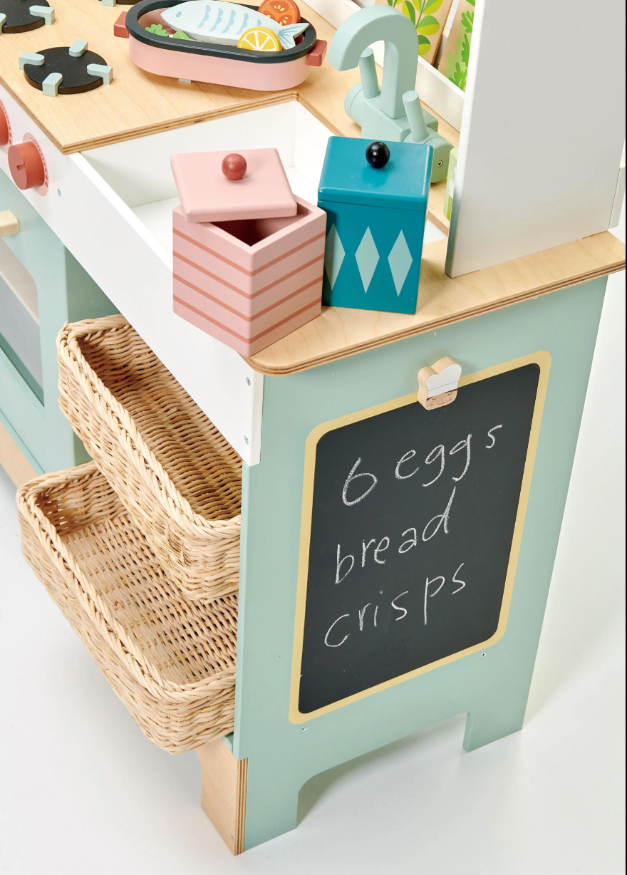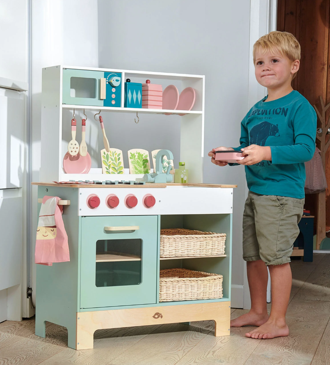 With an oven and integral microwave and plate rack, this kitchen range is made extra special with a multitude of original accessories. 2 wicker baskets provide lots of storage space for other pretend play food within the mini chef range, 2 wooden storage jars, 3 racks of herbs, 3 pretty plates, a printed gingham potholder, a printed mini chef tea towel, and 3 cooking utensils.
