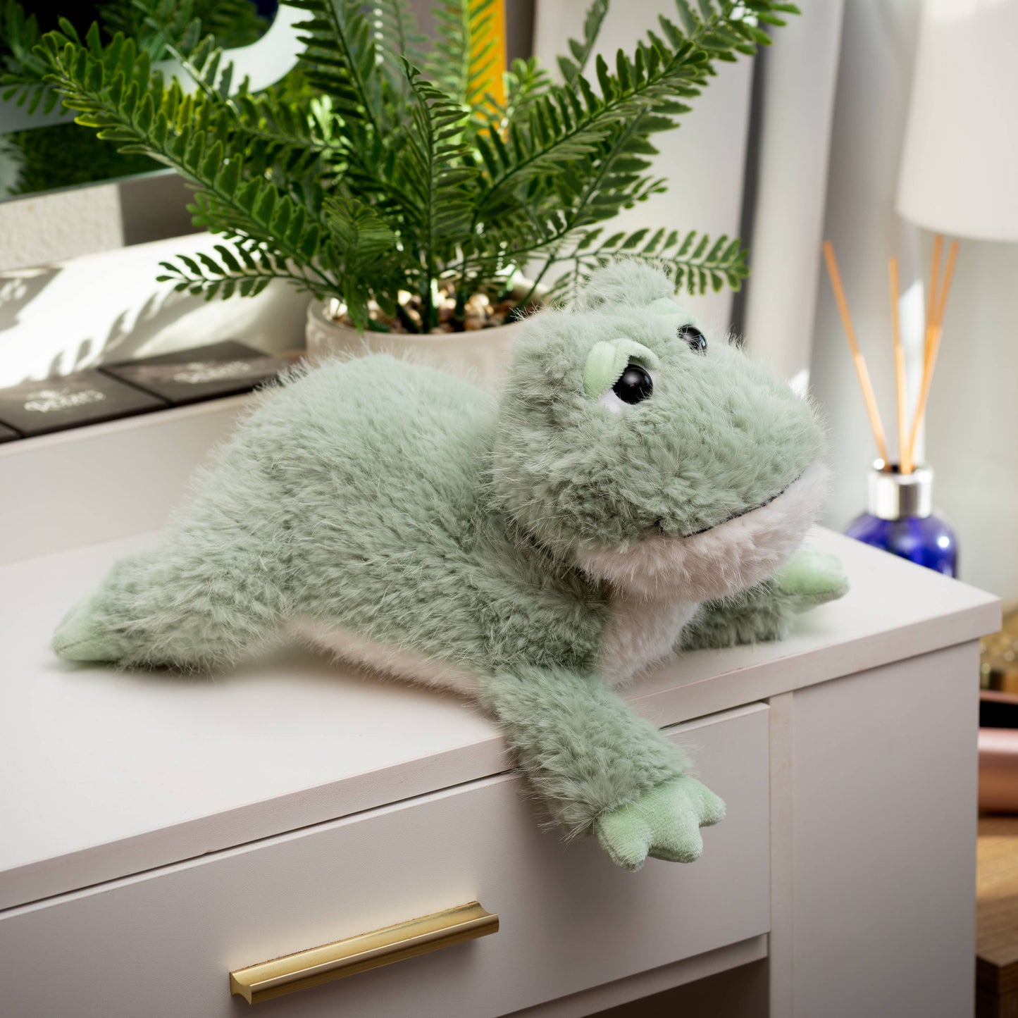 Leap into a world of tranquility with the 12-inch Frog Fuzzlez plush toy, a sage-green companion that radiates a cozy and calming vibe. This realistic stuffed animal is far from ordinary, featuring shaggy fur and dreamy colors that make it a stylish addition to any plushie personality crew.