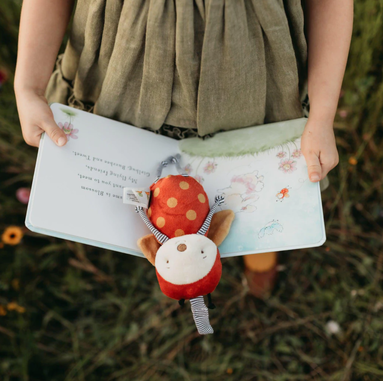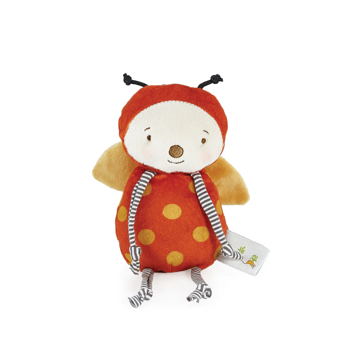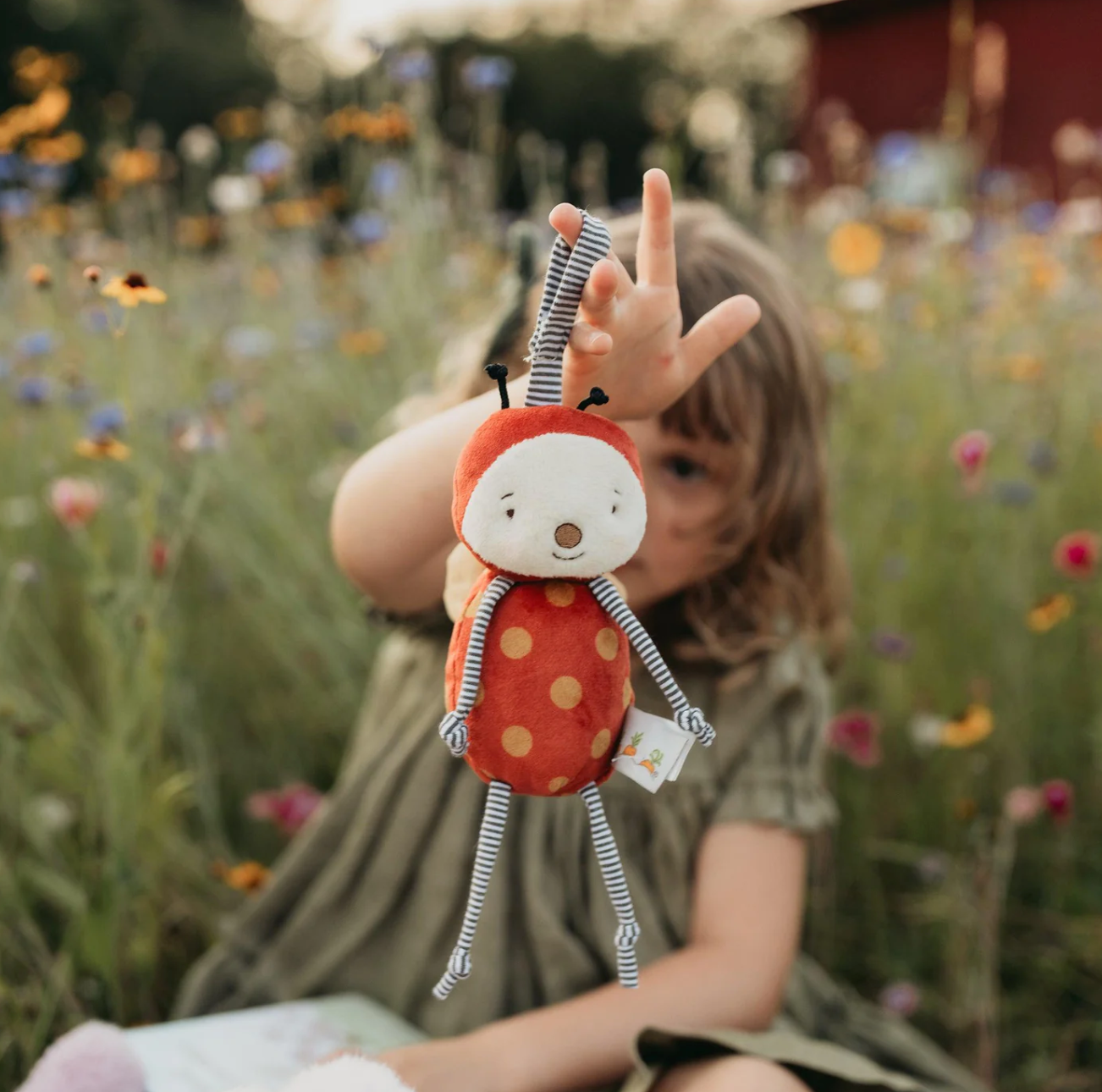 Soft red and orange velour, with knit dangly arms, legs, and antenna, and a velcro loop for attaching to strollers and car seats this little bug is sure to become a treasured toy for your little one.