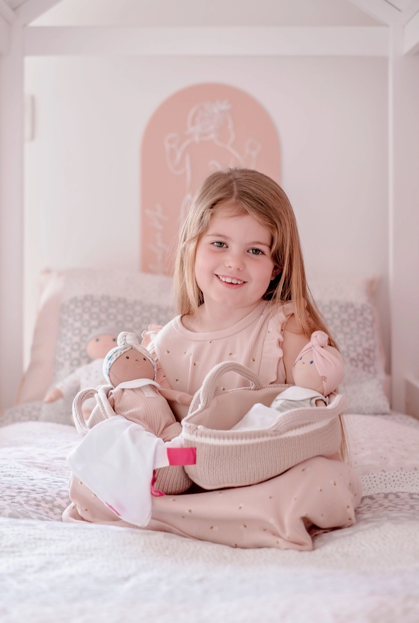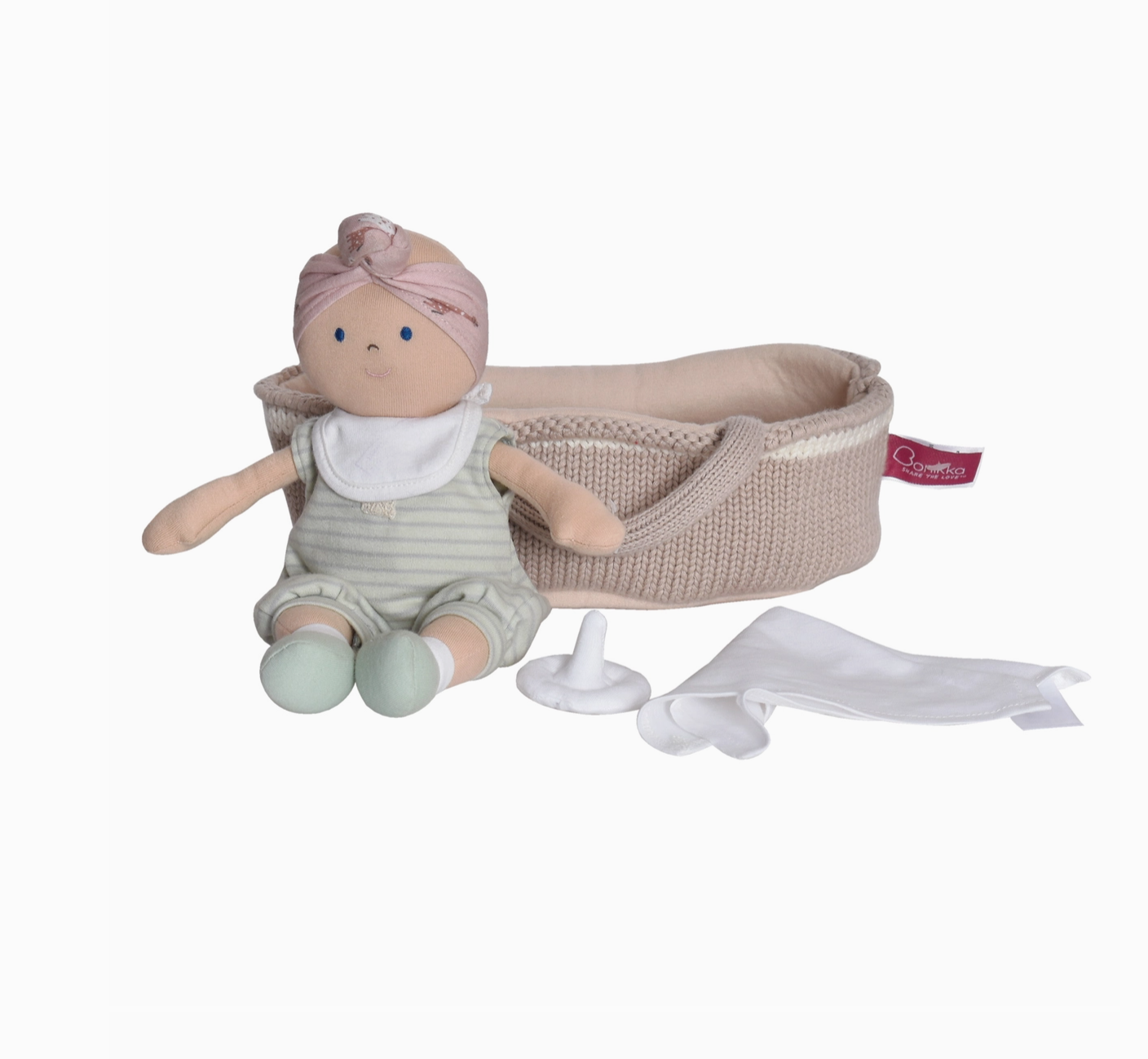 A beautiful choice for babies, toddlers and older kids alike, our fabric baby doll comes with a cute bandana, knitted carry cot, soother, bib and a blanket.