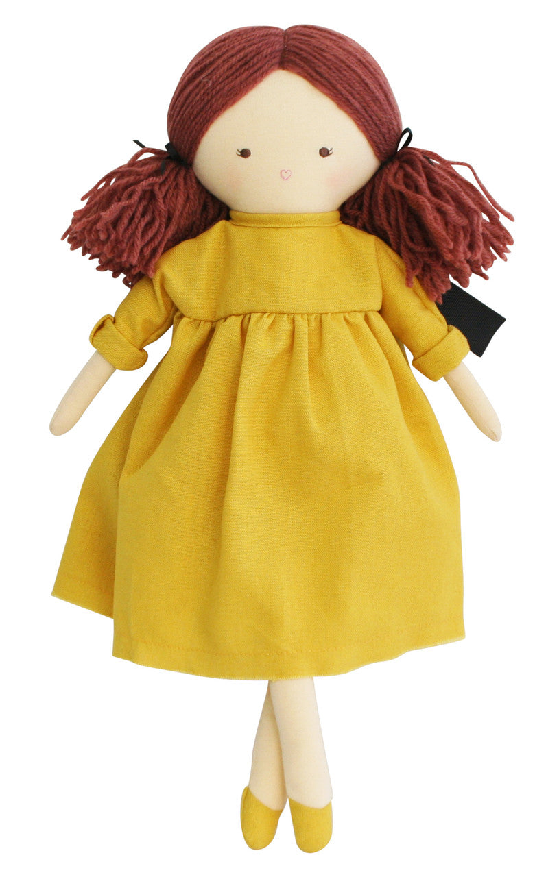 Matilda is an adorable 45cm doll with gorgeous red hair and an on trend butterscotch linen frock. So comfy!