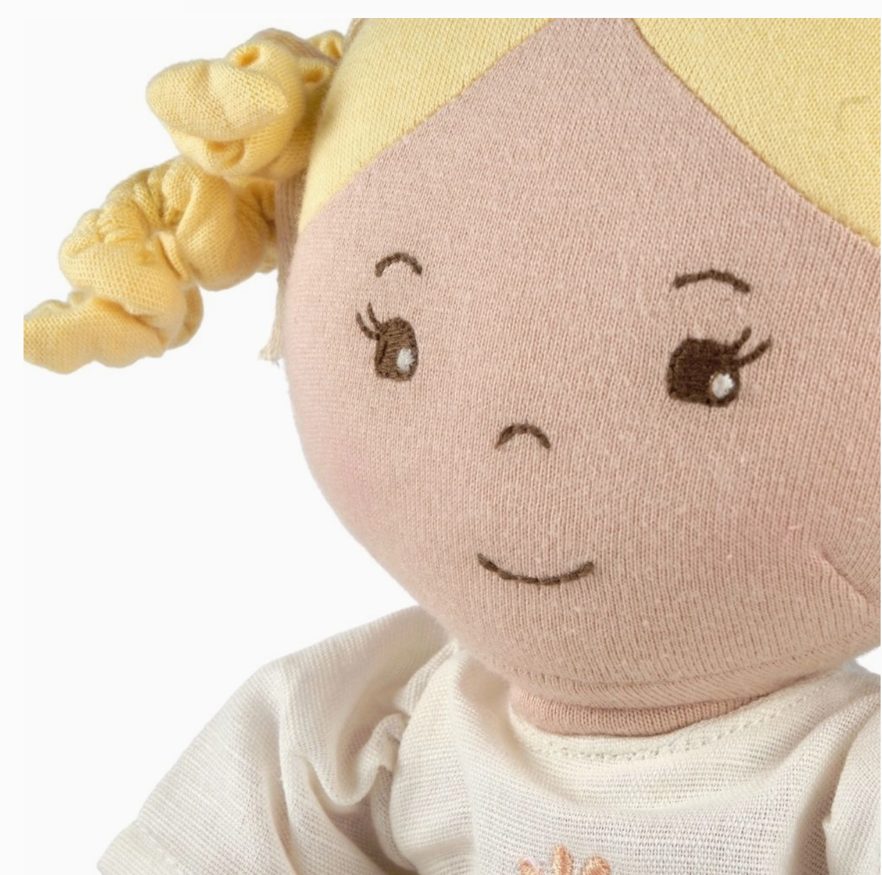 Beautiful and special Easter gift! Size 16.5 in Age Recommendation: 0+ months Dress - 70% Cotton 30% Flax Skin and Hair - 100% Cotton Single Jersey Legs - 100% Cotton Printed Single Jersey Filling: 100% recycled PET Fibers Features: Soft body doll with plush hair, and embroidered facial features. Safety Standards: This product complies with European EN71, US ASTM F963 Standards. For light cleaning, wipe the surface of this ragdoll toy with soapy water and a damp cloth. Sustainable-Biodegradable-Socially Responsible Manufacturing