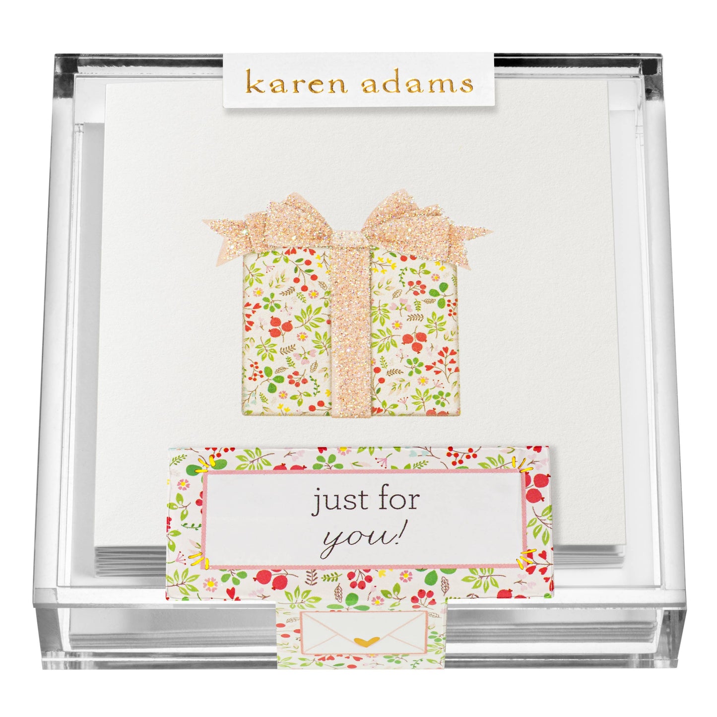 Send best wishes with this perfectly adorable box of hand-glittered cards featuring a gift. Book folded cards, blank on the inside.