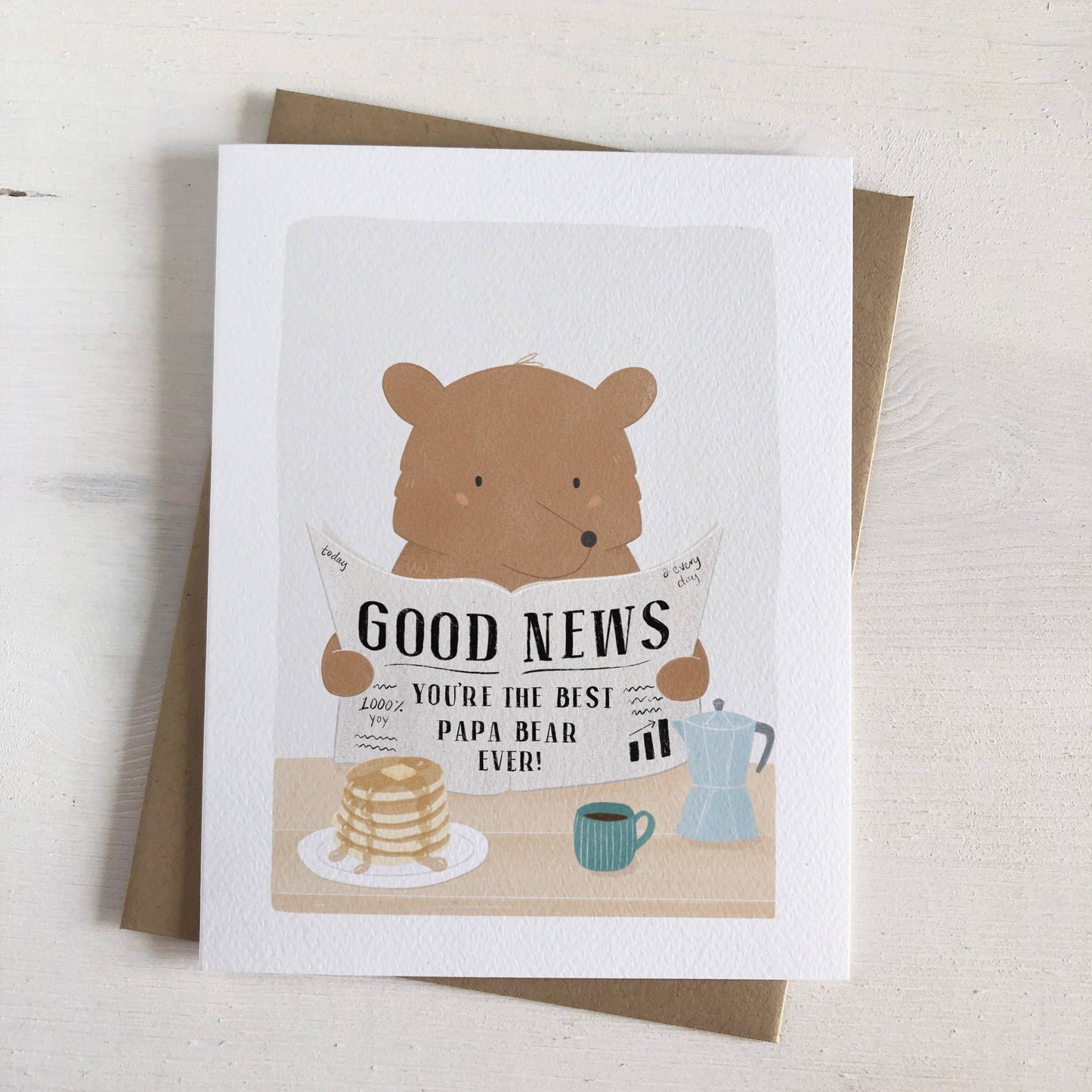 A charming card for dads your customers will love, this card features an adorable, hand-drawn illustration of a papa bear reading a newspaper that announces “you’re the best papa bear ever!” This design and loving message, complete with every dad’s favorite breakfast—pancakes and coffee, make for a fun and heartwarming way to celebrate fatherhood and Father’s Day.