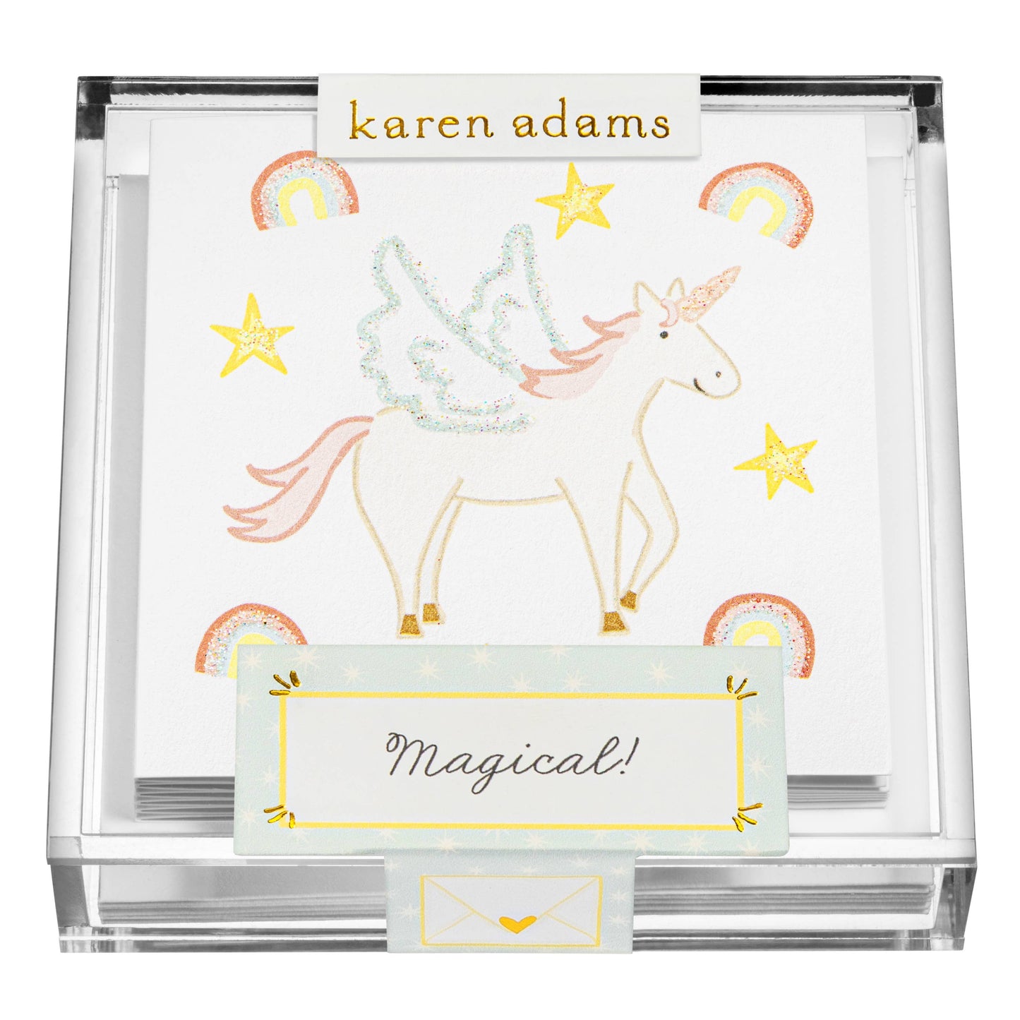 Send kindness with this perfectly adorable box of hand-glittered cards. Book folded cards, blank on the inside.