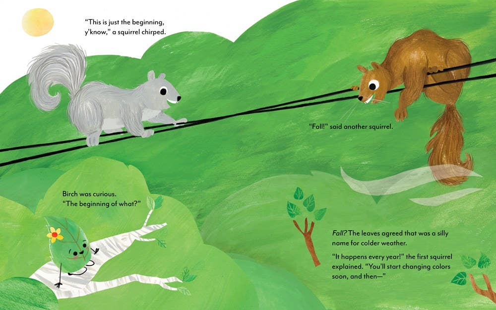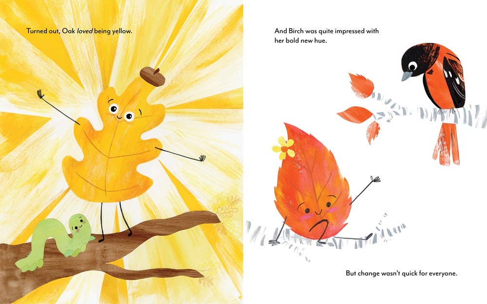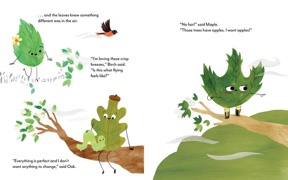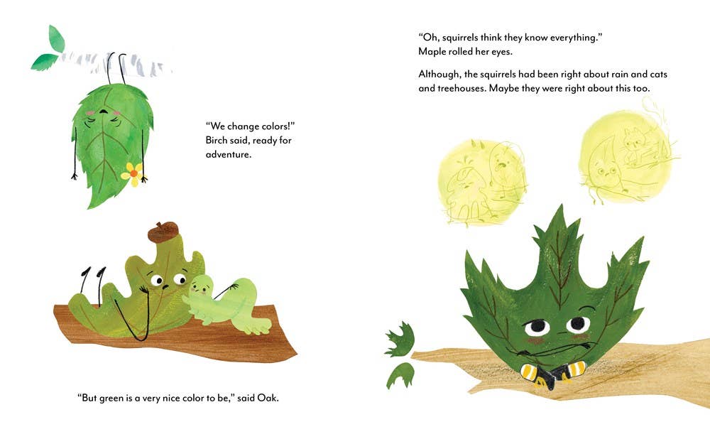 In this picture book destined to become a fall classic, life as a leaf is pretty sweet. The weather is pleasant, the view is fine, and everything just feels fresh. But when autumn breezes begin to blow, adventurous Birch, nervous Oak, and grumpy Maple each have their own way of facing the new crispness in the air. The squirrels take pleasure in warning the leaves about the transformations to come: New colors! And more … an actual fall. But will the ground be the end? Or a new beginning? This charming and reassuring picture book about finding joy in change will be returned to again and again.